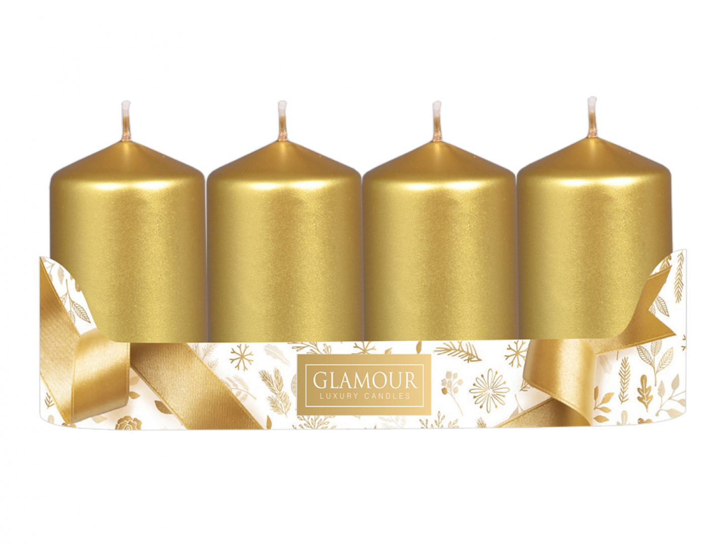 Sada adventních svíček. Mají tvar válce a povrch mají hladký, v úpravě metalický lesk. Jsou jednoduché a zároveň velmi efektní. Doba hoření: 30 hodin. Rozměr: průměr 5 cm, výška 9 cm. Balení obsahuje 4 ks svíček. Barva: zlatá.