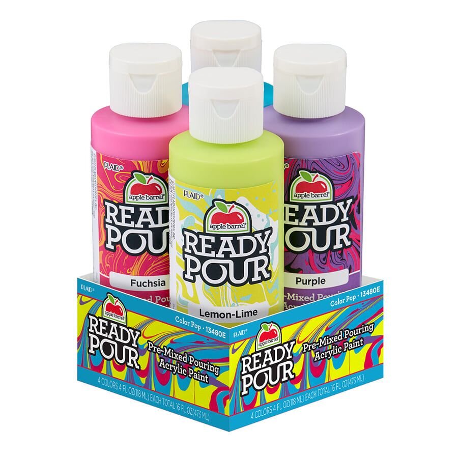 Apple Barrel Ready Pour™ Color Pop Set je sada čtyř předem namíchaných akrylových barev, ideální pro začátečníky. Vytváří výrazné a odvážné mramorové efekty bez potřeby míchání. Barvy po zaschnutí poskytují jemný saténový povrch a jsou netoxické.