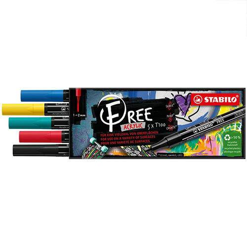 S radom STABILO FREE Acrylic Marker môžete takmer neobmedzene navrhovať a individualizovať. K dispozícii sú popisovače s tromi starostlivo vybranými variantmi hrotov a až 20 krycími farbami. Nepriehľadná a svetlostála pigmentová akrylová farba, vhodná na takmer všetky povrchy,od papiera cez kameň až po keramiku, umelú kožu a drevo. Každý môže nechať voľný priebeh svojej kreativite pri písaní, maľovaní, značkovaní, šrafovaní a kontúrovaní.