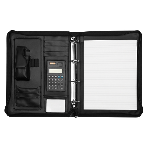 Exkluzivní portfólio na dokumenty vybavené čtyřkroužkovou mechanikou, blokem na poznámky. Zabudovaná kalkulačka. Prostor na mobilní telefon, pera a další drobnosti. Rozměr 345x265x40mm. číst celé