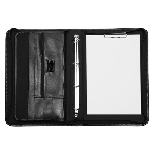 Portfólio vybavené 4-kroužkovou mechanikou a klipem, s vnitřními přepážkami na dokumenty, uzavíraní na zip, materiál imitace kůže, formát A4, v černém provedení. Rozměr: 360x260x50 mm