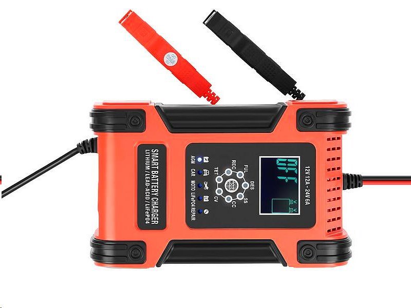 Multifunkční inteligentní síťová nabíječka 12 V a 24 V pro automobilové, gelové, AGM a LiFePO4 baterie s výkonem 150 W. Přehledný LCD displej s ukazatelem napětí, proudu, teploty ad.