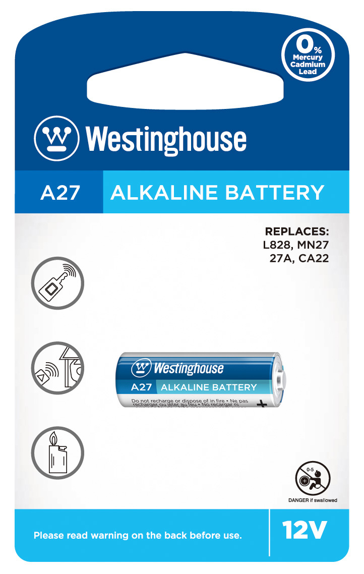 Alkalické primární baterie 12 V, kapacita 26 mAh Provedení = mikrotužkové Typ = A27 Rozměry = 7,7 x 28 mm Výrobce = Westinghouse Alternativní značení:E27A, V27A, V27PX, V27GA, L728, L828, MN27, G27A, GP27A, WE27A, CA22, UM27A, LR27A, K27A, 27AE, A27S