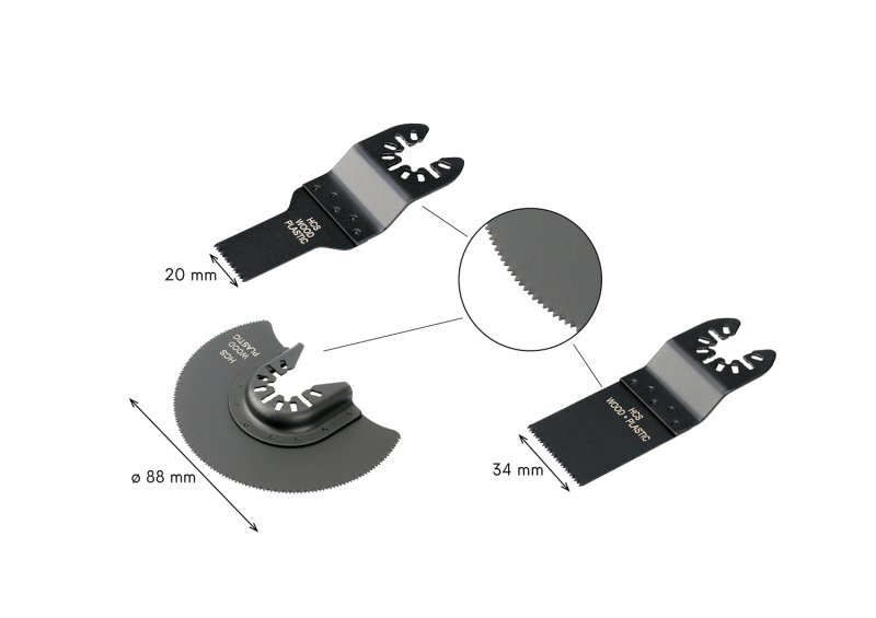 sada tří nástrojů s univerzálním OIS upínáním pro oscilační brusky HCS - vysokouhlíková ocel, vhodné pro řezání a ponorné řezání dřeva, plastů, sádrokartonu číst celé