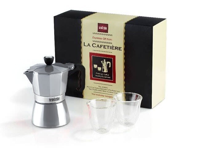 Dárková sada La Cafetiere Classic Espresso - moka konvice na 3 šálky + 2 dvoustěnné sklenice na espresso, stříbrná