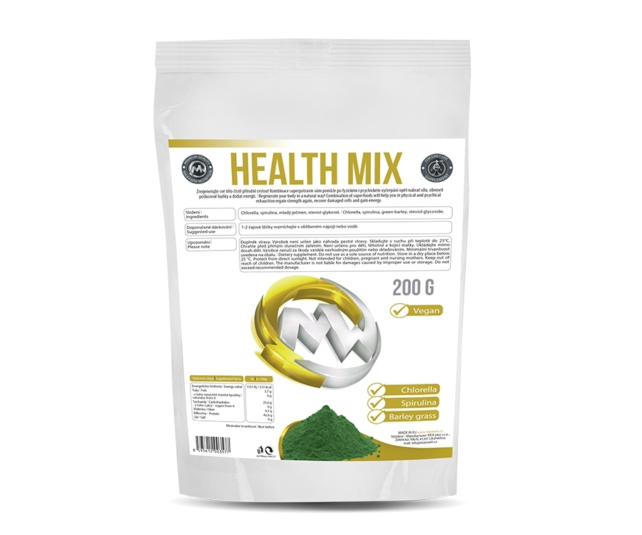 HEALTH MIX VEGAN 200 g ČISTÉ ROZEMLETÉ SUROVINY BEZ PŘIDANÝCH LÁTEK Zregenerujte své tělo čistě přírodní cestou! Kombinace superpotravin vám pomůže po fyzickém i psychickém vyčerpání opět nabrat sílu, obnovit poškozené buňky a dodat energii. Kromě silného detoxikačního účinku této kombinace vám Chlorella zajistí potřebnou regeneraci a splní prebiotickou úlohu díky mnoha obsaženým prospěšným látkám, Spirulina dodá potřebné vitamíny a je bohatým zdrojem bílkovin s obsahem všech esenciálních aminokyselin a Mladý ječmen využijete pro jeho detoxikační a acido-alkalické účinky. •Detoxikační účinky •Fyzická a psychická regenerace •Obnovuje poškozené buňky a dodává energii