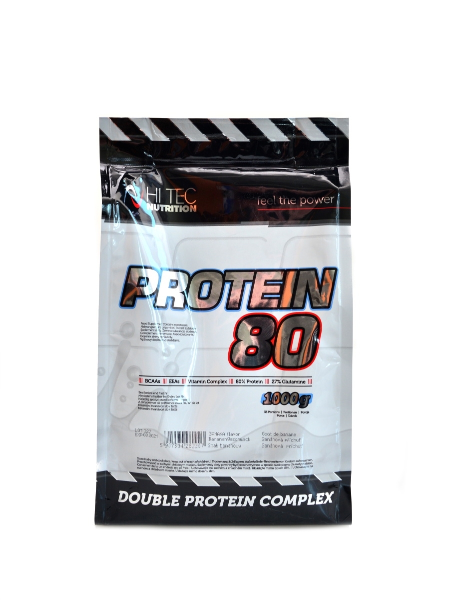 PROTEIN 80 je vysokoproteinová výživa, obsahující 80% vysoce kvalitních bílkovin. Přípravek je základem pro tvorbu silných a velkých svalů. Díky spojení koncentrátu syrovátkové bílkoviny s pšeničnou bílkovinou PROTEIN 80 doplňuje dietu intenzivně trénujícího sportovce o komplexní sadu esenciálních a neesenciálních aminokyselin, pro které je charakteristický dlouhý čas asimilace. Jednotlivé bílkovinné komponenty přípravku se navzájem doplňují a tvoří tak výrobek velmi vysoké biologické hodnoty BV= 105. Pro koncentrát syrovátkové bílkoviny, obsažené v přípravku, je charakteristická vysoká nutriční hodnota, anabolická aktivita a imunostimulace. Díky vysokému obsahu glutaminu a aminokyselin BCAA, PROTEIN 80 zlepšuje dusíkovou bilanci organismu a má silné antikatabolické účinky. Přípravek je doporučován zejména závodním sportovcům a osobám fyzicky aktivním.