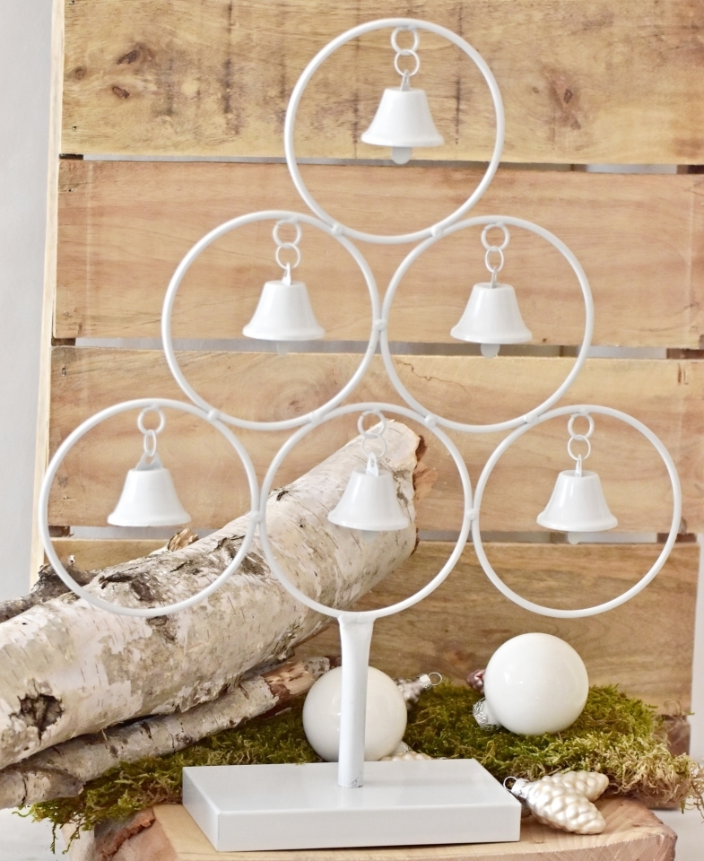 Stylová dekorace do moderního interiéru - kovový stromeček se zvonečky na stojanu.