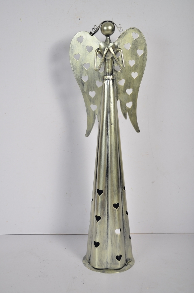 Plechový srdíčkový anděl na čajovou svíčku, 53 cm, champagne