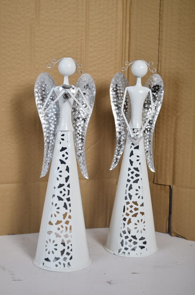 Plechový anděl Nova bílo-stříbrný 30 cm, na čajovou svíčku