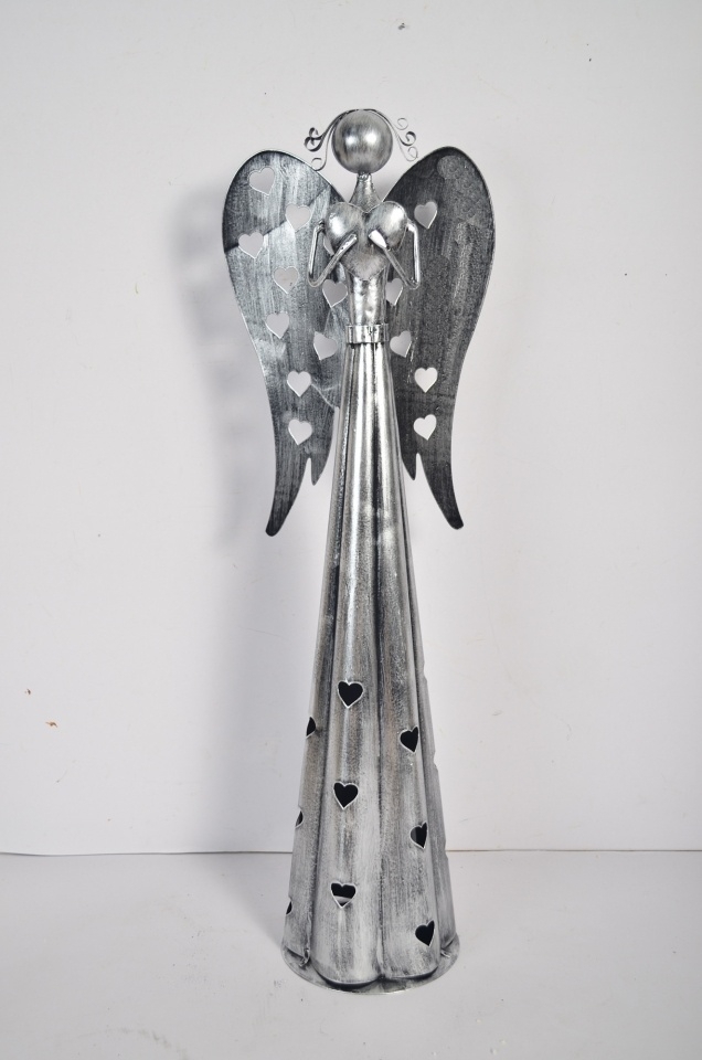 Plechový srdíčkový anděl na čajovou svíčku, 67 cm, stříbrný