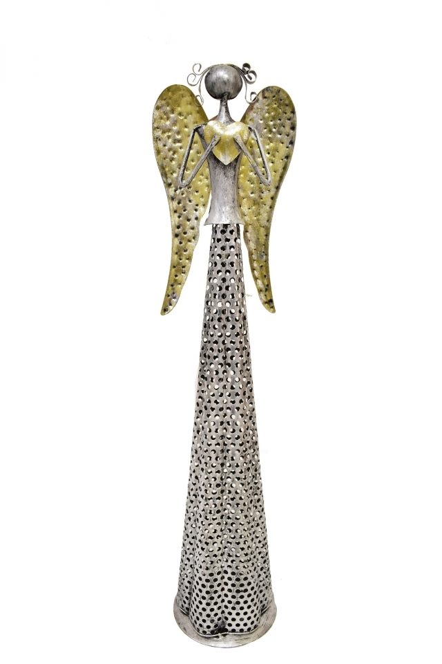 Moderní plechový anděl držící v rukách srdíčko. Dekorace do interiéru, která dělá radost po celý rok. Andílek má v sukýnce LED osvětlení na 3x AAA 1,5V baterie. Baterie nejsou součástí výrobku. BEZ KRYTU NA BATERIE.