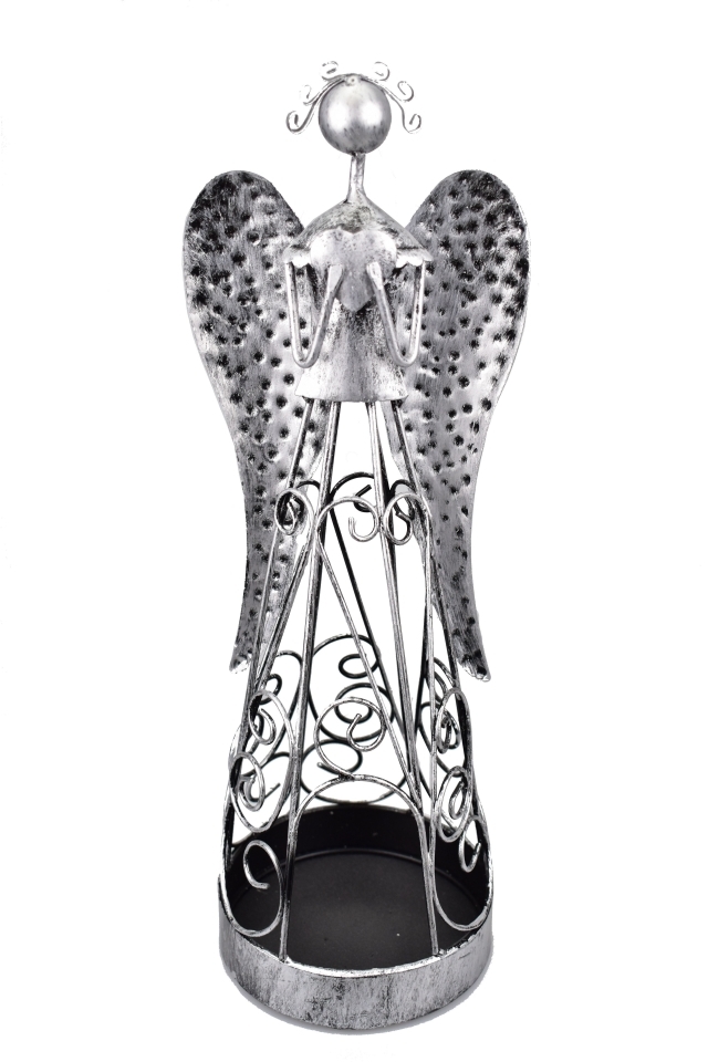 Stříbrný plechový anděl má v sukýnce kalíšek na čajovou svíčku.Anděl má buď srdce nahoře. Andílci ozdobí váš byt o vánočních svátcích a můžou být stylovou dekorací po celý rok. II.jakost z důvodu umístění otvoru kalíšku na svíčku v přední části sukýnky.