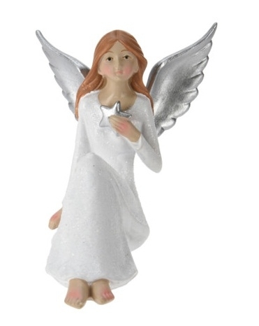 Polyresinový anděl se stříbrnými křídly a glitry.