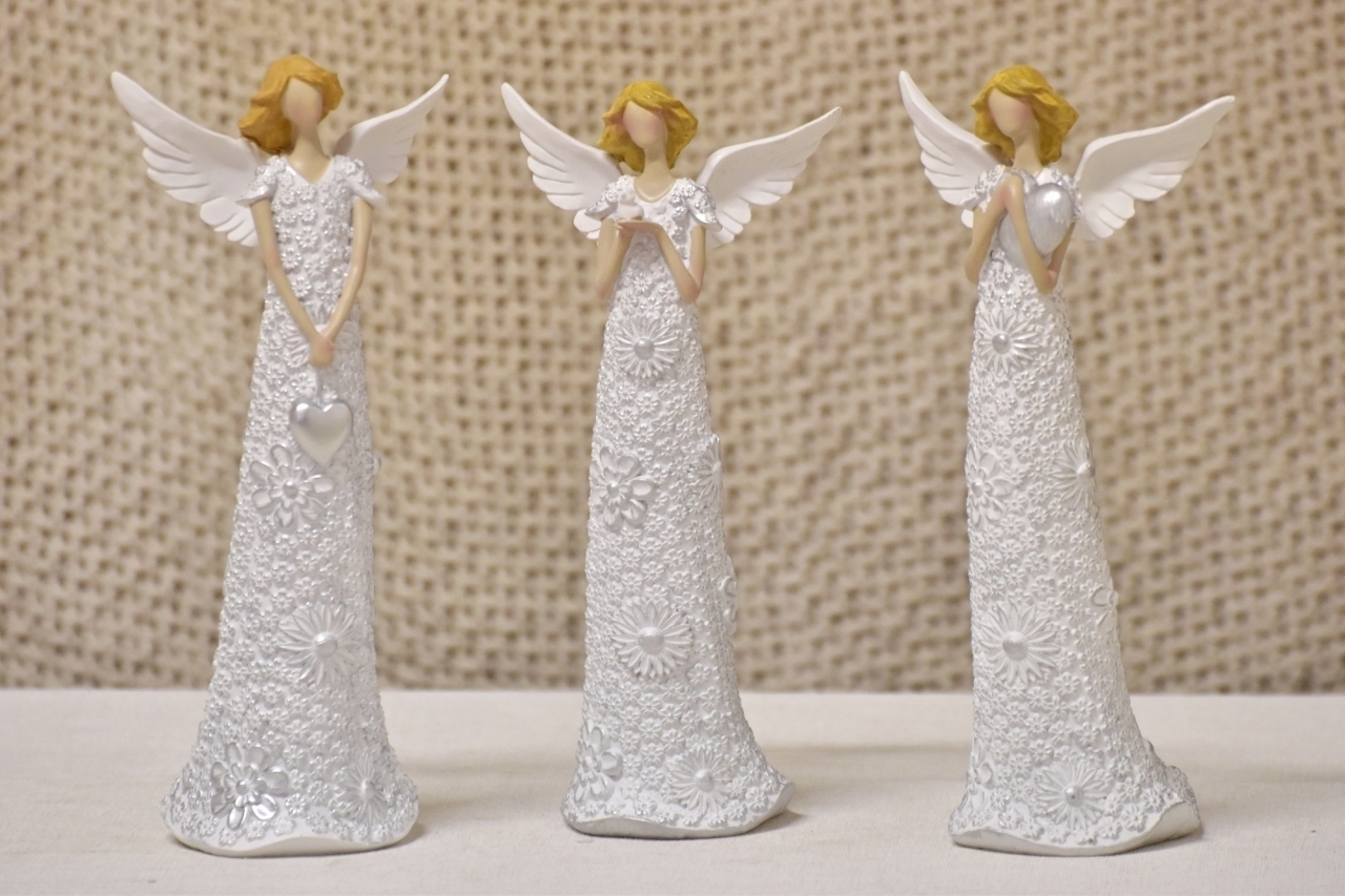 Soška anděla v šatech z drobných kvítků se stříbrnou patinou. Andílek může být pěkným dárkem i milou pozorností pro vaše přátelé.