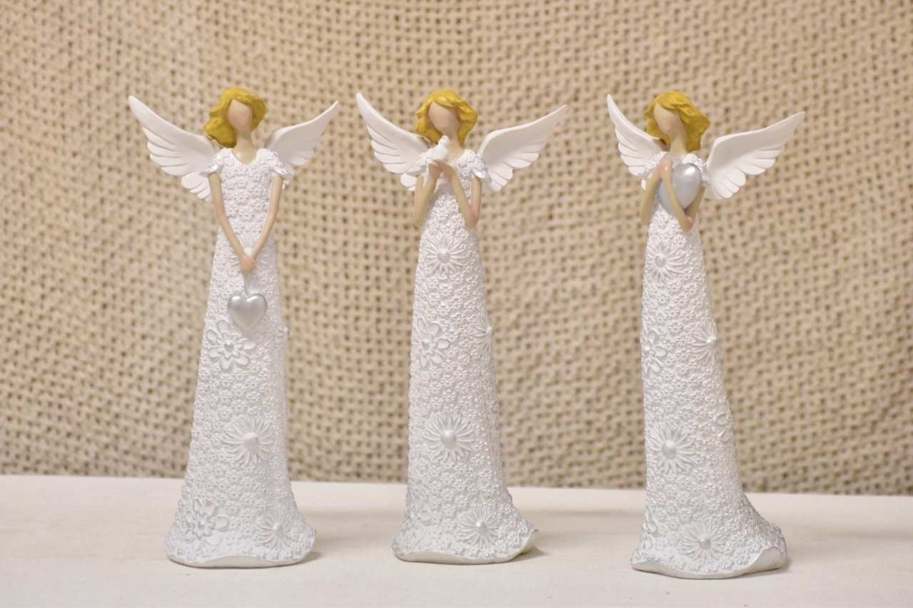 Soška anděla v šatech z drobných kvítků se stříbrnou patinou. Andílek může být pěkným dárkem i milou pozorností pro vaše přátelé.