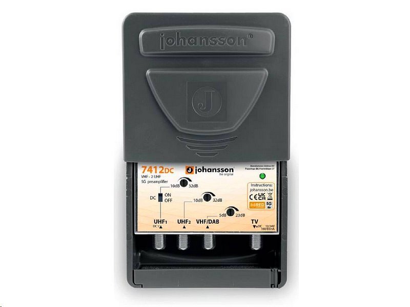 Zesilovač Johansson 7412DC je navržen pro kvalitní zesílení televizního signálu v pásmech VHF a UHF. Díky třem vstupům (1x VHF, 2x UHF) umožňuje kombinaci signálů z různých antén, čímž zajistí optimální pokrytí a čistý příjem. Je ideální volbou pro použití v rodinných domech, bytových domech i v komerčních objektech.