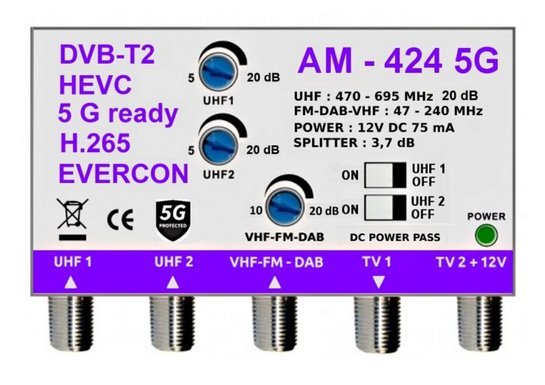 Anténní zesilovač EVERCON AM-424 5G je určen do oblastí s běžnou úrovní DVB-T2 signálu, hlavně do městských aglomerací s hustou sítí 5G a LTE dokrývačů. Je totiž extrémně odolný vůči přebuzení a do jeho vstupů může být přiveden signál s úrovní až 80 dBuV.