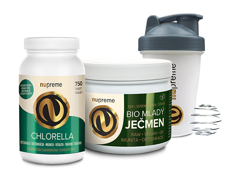 Nupreme Chlorella BIO 750 tbl + Mladý ječmen premium 200 g BIO + Shaker