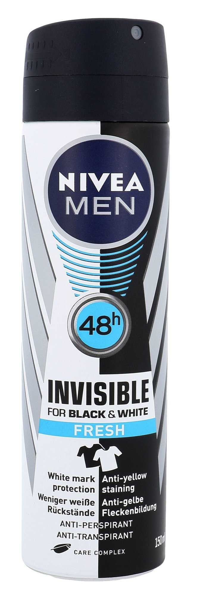 **Nivea Men Invisible For Black & White 48h Fresh** Antiperspirant. Antiperspirant Nivea Men Invisible For Black & White 48h Fresh předchází vzniku bílých stop na černém oblečení a žlutých skvrn na bílém oblečení. Poskytuje 48hodinovou ochranu proti pocení a zápachu. Se svěží vůní pro pocit čistoty. **Použití**: Aplikujete ze vzdálenosti 15 cm přímo na pokožku podpaží. Nechte zaschnout. Nepoužívejte na poraněnou či podrážděnou pokožku.