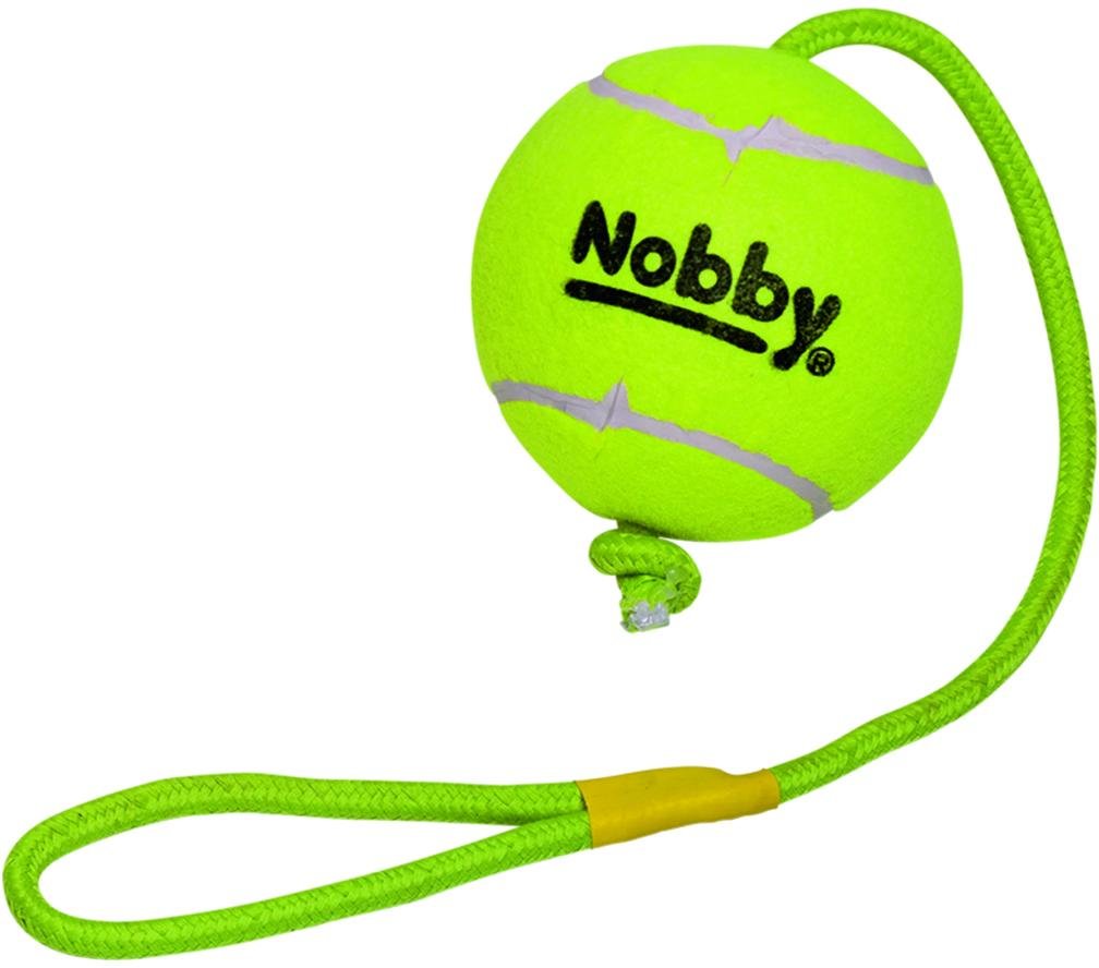 Vysoce kvalitní tenisový míček na laně značky Nobby. Nejoblíbenější aportovací hračky pro velké psy. Lano o délce 70cm připevněné k míčku oceníte hlavně při aportování, výcviku i při hře ve vodě. Velikost tenisového míčku ø 12,5 cm. Míček je vyroben z velmi kvalitního materiálu. kvalitní kaučuková směs povrch ze speciální neabrazivní plsti, která narozdíl od běžných tenisových míčků neobrušuje psí zuby Povrch hračky je ozdoben logem Nobby. Upozornění: Hračka není vhodná ke stálému a silnému žvýkání. Hračka je určena k použití pod dozorem, poškozenou hračku zvířeti odeberte. Není určeno pro děti.