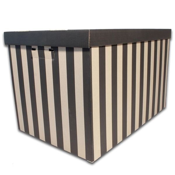 Tyto úložné kontejnery jsou vyrobeny z kvalitní třívrstvé vlnité lepenky, což zajišťuje jejich pevnost a zároveň lehkost. Hnědá lepenka s černým potiskem působí decentně a hodí se do jakéhokoliv interiéru. Vyříznuté úchytky po stranách usnadňují jejich přenášení, a to i když jsou plné. S nosností až 15 kg a skládaným dnem doplněným o proložku získáte odolný kontejner, který unese i těžší předměty.