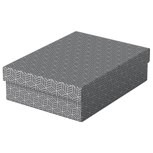 Sada tří středních lepenkových úložných boxů s moderním a stylovým geometrickým designem. Ideální na dárky nebo na ukládání osobních dokumentů, hraček, knih a dalších drobností. Lze použít samostatně nebo uložit na polici. Použijte box k zabalení dárku a obdarovaný ho pak může použít jako úložný box. Sundávací víko skryje obsah a ochrání před prachem. Neutrální barvy a design doplní jakýkoli styl a box je díky němu možné použít jako dárek. Dodávají se v plochém balení a lze je rychle a snadno sestavit. Strany se při sestavování skládají přes sebe, takže jsou dvojnásobně pevné. Otíratelný povrch Vyrobeno z pevné a odolné 100% recyklované a 100% recyklovatelné vlnité lepenky. Obal je 100% recyklovaný a 100% recyklovatelný bez obsahu plastů. Rozměry 265 x 100 x 360 mm