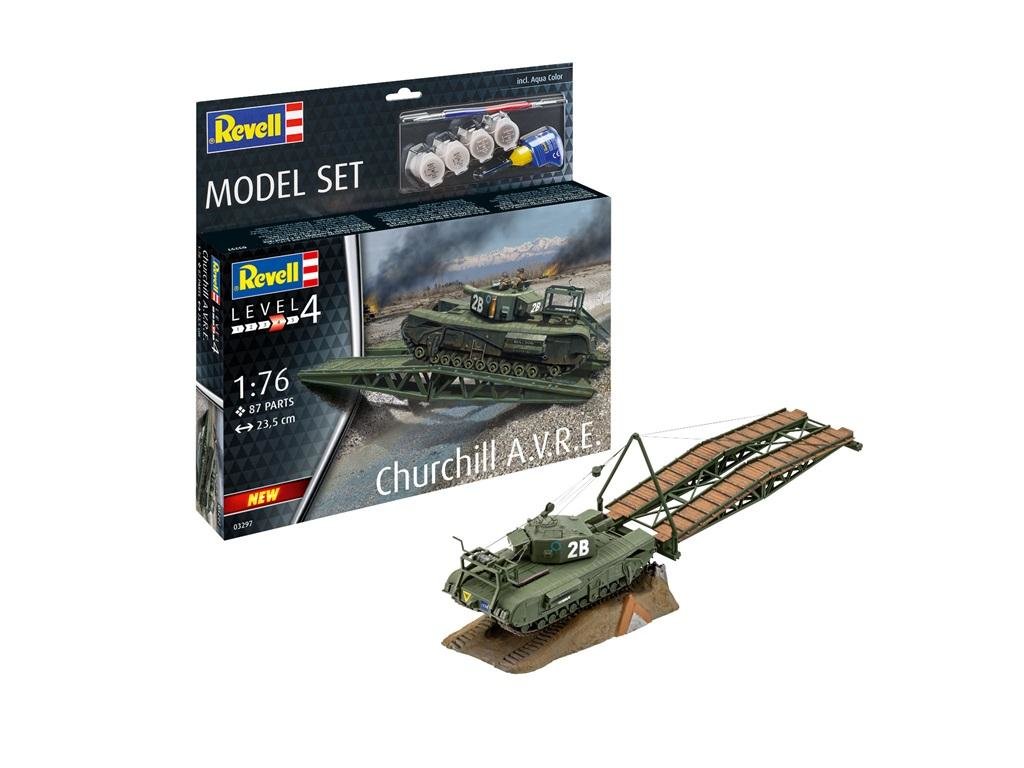 Zestaw modelarski z akcesoriami (podstawowe farbki, pędzelek, klej). Churchill A.V.R.E. - brytyjski ciężki czołg piechoty. Zalecane kolory farb: 32108, 32183, 32184, 32187. Plastikowy model do sklejania Revell (REV-63297). Specyfikacja Numer katalogowy:REV-63297 Producent: Revell Długość: 235 mm Szerokość: 57 mm Wysokość: 77 mm Skala: 1:76 Stopien trudności: 4 Ilość elementów: 87 Instrukcja: tak Grupa wiekowa: 12+