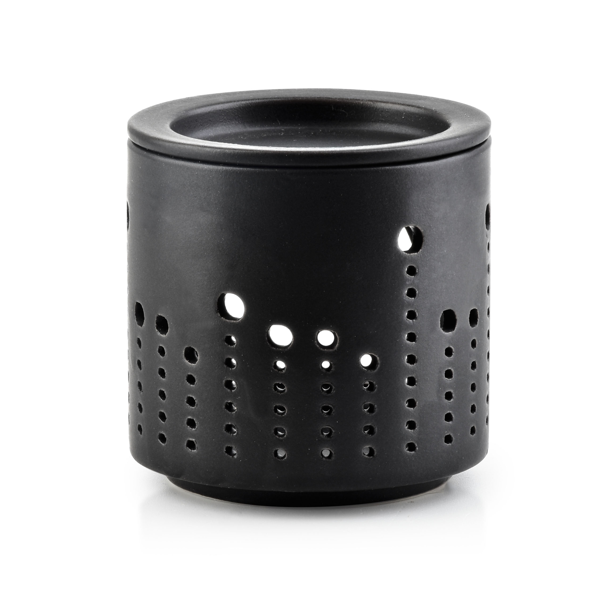 Kominek na olejek zapachowy ceramiczny VESTA - czarny matowy dwuelementowy z otworem z góry i z boku wymiary: 7,3x7,3xH:7,5cm