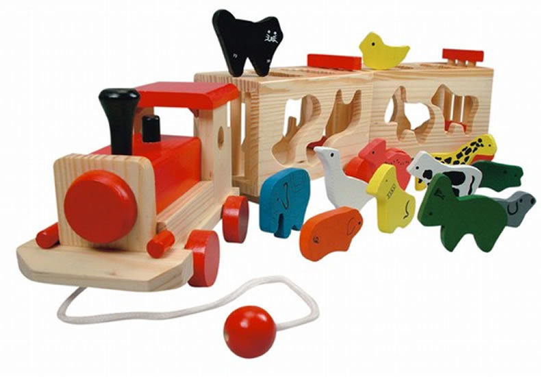 Malá ZOO na kolečkách. Tahací dřevěná mašinka na kolečkách se dvěma vagonky s otvírací mříží pro spoustu zvířátek. Ale pozor, každé zvířátko může do vagonku jen jedním otvorem a musíte najít ten správný! Nejen vláček, ale i zábavná vkládačka. Rozměry: 66 x 11 x 10,5 cm, 14 dílů