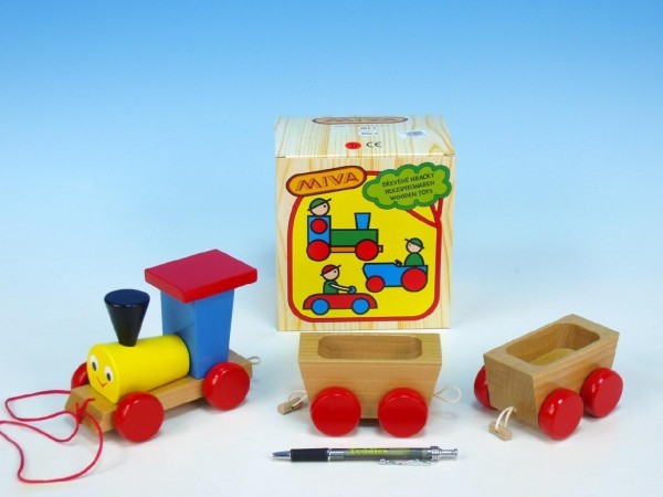 Vlak + 2 vagónky dřevo tahací barevný celková délka 43cm v krabici