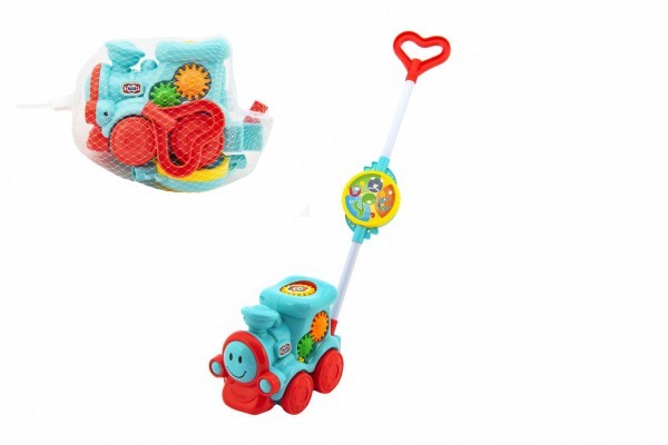 Strkadlo lokomotiva tlačící plast 50cm na kolečkách s tyčkou na baterie se zvukem se světlem v síťce