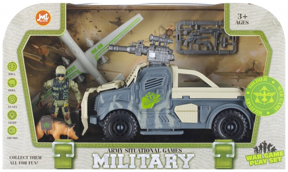 Zalety produktu: posiada ruchome elementy, posiada efekty dźwiękowe oraz świetlne. Wojskowy samochód do działań specjalnych od MEGA CREATIVE Zawsze gotowy do działania na wypadek wybuchu wojny Zawartość zestawu: samochód wojskowy, figurka żołnierza, figurka psa, samolocik. Wymiary/waga/baterie: wymiary produktu dł. x wys. x gł. cm : 23x13x8, wymiary opakowania dł. x wys. x gł. cm : 37x21x9, waga produktu bez opakowania kg : 0, 26 kg, waga produktu w opakowaniu kg : 0,37 kg, wymaga zasilania bateriami 3 x AG13- załączono do zestawu. Zestaw przeznaczony dla dzieci w wieku: 3 . Pakowany w kartonik z okienkiem. W kartonie zbiorczym po 24 szt.
