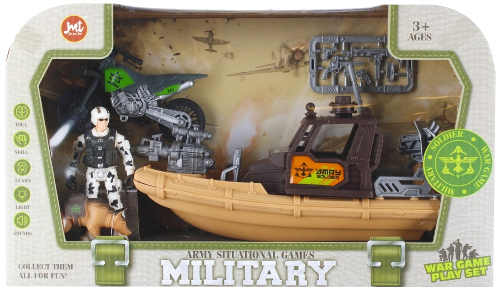 Zalety produktu: posiada ruchome elementy, posiada efekty dźwiękowe oraz świetlne. Wojskowa łódka do działań specjalnych od MEGA CREATIVE Zawsze gotowa do działania na wypadek wybuchu wojny Zawartość zestawu: łódka wojskowa, motor, figurka żołnierza, figurka psa, akcesoria wojskowe. Wymiary/waga/baterie: wymiary produktu dł. x wys. x gł. cm : łódka-29x11x8, motor-12x8x5, wymiary opakowania dł. x wys. x gł. cm : 37x21x9, waga produktu bez opakowania kg : 0, 25 kg, waga produktu w opakowaniu kg : 0,36 kg, wymaga zasilania bateriami 3 x AG13- załączono do zestawu. Zestaw przeznaczony dla dzieci w wieku: 3 . Pakowany w kartonik z okienkiem. W kartonie zbiorczym po 24 szt.