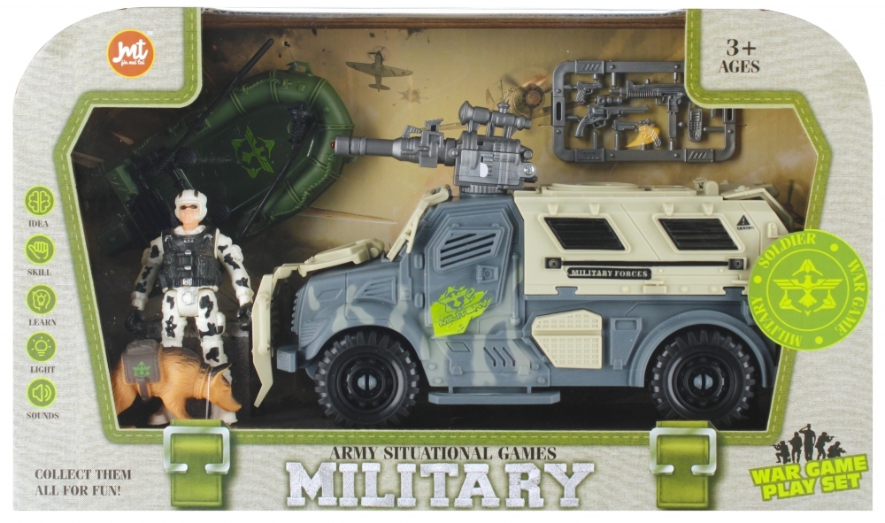 Zalety produktu: posiada ruchome elementy, posiada efekty dźwiękowe oraz świetlne. Wojskowy samochód do działań specjalnych od MEGA CREATIVE Zawsze gotowy do działania na wypadek wybuchu wojny Zawartość zestawu: samochód wojskowy, figurka żołnierza, figurka psa, ponton. Wymiary/waga/baterie: wymiary produktu dł. x wys. x gł. cm : 23x13x8, wymiary opakowania dł. x wys. x gł. cm : 37x21x9, waga produktu bez opakowania kg : 0, 26 kg, waga produktu w opakowaniu kg : 0,37 kg, wymaga zasilania bateriami 3 x AG13- załączono do zestawu. Zestaw przeznaczony dla dzieci w wieku: 3 . Pakowany w kartonik z okienkiem. W kartonie zbiorczym po 24 szt.