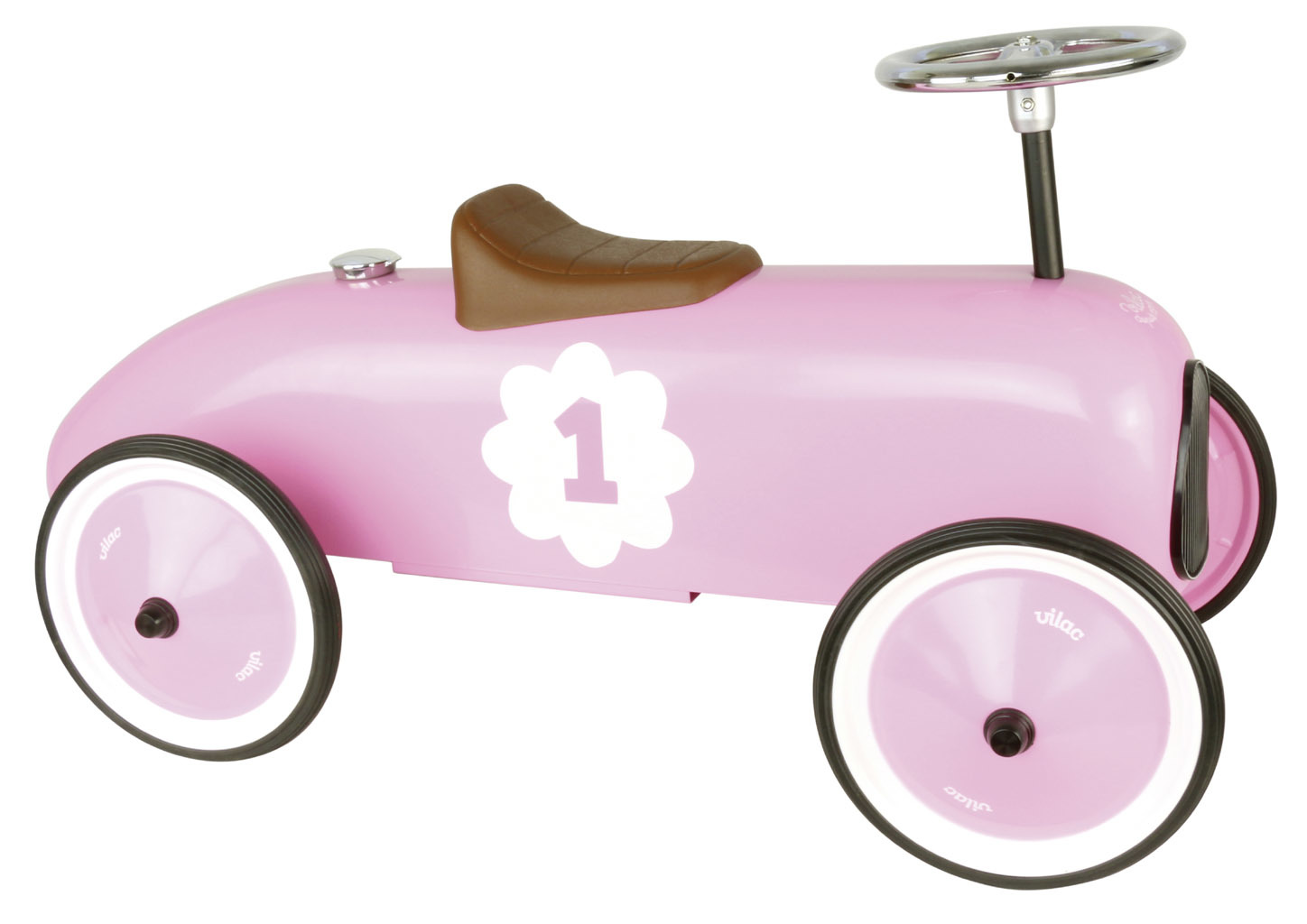 Vintage napodobenina závodního auta je plně kovová a má růžovou metalickou barvu. Volant ovládá zatáčení předních kol. Hnědé sedadlo je vyrobeno z plastu. Kola odrážedla jsou pogumovaná a zaručují tak tichý chod i na pevném povrchu. Hračky Vilac mají značku francouzské agentury ADEME, to znamená, že tyto dřevěné hračky jsou vyráběny ekologicky. Šetří životní prostředí, neznečišťují půdu, vodu a vzduch, neplýtvají energiemi. Již více než 100 let plní značka Vilac dětské sny. Společnost Vilac sídlí hluboko v srdci pohoří Jura, obklopena horami, jezery a lesy. Tato francouzská společnost vyrábí od roku 1911 dřevěné hračky v klasickém, starodávném stylu s moderními barvami a vzory. Hračky Vilac jsou jedinečné, nikdy nevyjdou z módy a dokáží okouzlit všechny generace. Vilac pomáhá utvářet dětskou představivost svými radostnými ilustracemi či dizajny a reinterpretací klasických hraček, které se jen tak neopotřebují. Děti dostávají na Vánoce a narozeniny spousty hraček, většina z nich je však nezaujme na dlouhou dobu, láska k hračce se nenaplní. Dřevěné hračky Vilac vzbuzují vášeň i o 50 let později, když jako dospělí náhodou najdete v podkroví hračky, které jste jako děti milovali. Vilac již 100 let propojuje děti s hračkami, které si oblíbí a váží si jich. A proč je děti tak milují? To zůstává tajemstvím firmy Vilac.