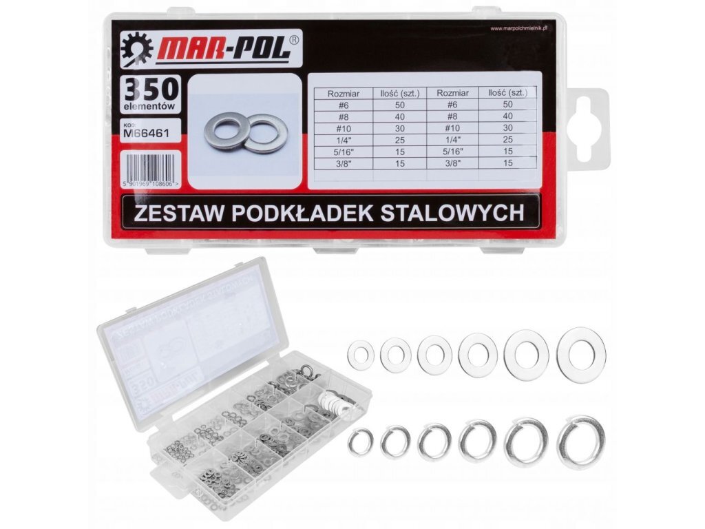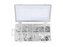 Sada 350ks ocelových podložek umístěná v plastovém boxu s přihrádkami.