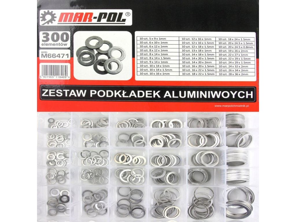 Sada 300ks hliníkových podložek umístěná v plastovém kufříku s přihrádkami.