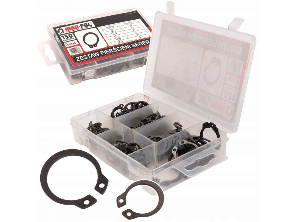 Univerzální pojistné seger kroužky z pružinové oceli. Univerzální sada využitelná ve specializovaných garážích, autoservisech a opravnách pevné, odolné proti mechanickému poškození. Kroužky jsou uspořádány a uloženy v praktickém boxu.