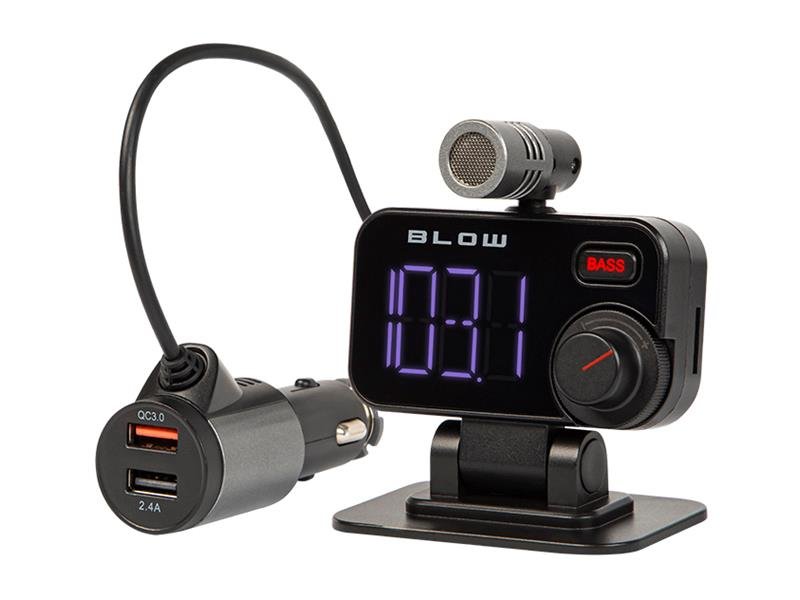 Jak to funguje? Připojte USB nabíječku do zásuvky zapalovače cigaret a poté nastavte stejnou frekvenci FM na vysílači i autorádiu. To umožní přenos zvuku z externích zařízení (např. Telefonu) do autorádia. Více zdrojů přehrávání hudby Vysílač umožňuje posílat hudbu do našeho rádia prostřednictvím mnoha zařízení. Integrovaný slot umožňuje připojit kartu microSD (až 32 GB) s naší oblíbenou hudbou. Největší škálu možností však poskytuje funkce Bluetooth, díky níž je možné s touto funkcí přenášet zvuk z našeho telefonu nebo jiných zařízení. Zvýraznění basů Pociťte ještě lepší výkon a kvalitu zvuku díky našemu vysílači BLOW. Speciální tlačítko „BASS“ na předním panelu vám umožní posílit basy při poslechu naší oblíbené hudby, aby vám poskytlo ještě lepší hudební zážitek a vaše cesta byla ještě pohodlnější. Vysoce kvalitní externí mikrofon Vysoce kvalitní mikrofon zabudovaný do zařízení vám umožní bezpečně provádět hovory za jízdy. Telefon se k vysílači připojuje pomocí funkce Bluetooth - ve vysílači je to verze 5.0, která výrazně zlepšuje a stabilizuje přenos dat a je ještě lépe přizpůsobena mobilním zařízením a elektronickému bezdrátovému příslušenství. Příchozí hovor lze zvednout pomocí tlačítka na ovládacím knoflíku, které také umožňuje ukončit hovor a vytočit poslední hovor. Režim handsfree se při příjmu hovorů automaticky přepne ze stavu přehrávání hudby. In-line nabíječka s funkcí rychlého nabíjení Jeden z USB výstupů v nabíječce má funkci Quick Charge ve verzi 3.0. Toto moderní technologické řešení umožňuje nabíjet zařízení mnohem rychleji - ve srovnání s nejjednoduššími USB nabíječkami je dokonce několikrát zrychluje a zároveň nemá vliv na rychlejší spotřebu baterie. Druhý USB slot umožňuje nabíjení 5V / 2,4A. Intuitivní a pohodlné ovládání Kabel dlouhý 1,2 m umožňuje snadné připojení nabíječky přímo do zásuvky zapalovače cigaret, což umožňuje instalaci vysílače na jiném místě. Postranně umístěná ovládací tlačítka, stejně jako knoflík a funkce „BASS“ na předním panelu zajišťují intuitivní a rychlé ovládání všech funkcí vysílače. Bezpečnost použití Vysílač je vyroben z vysoce kvalitních materiálů, které zajistí odolnost a dlouhou životnost. Má značku „CE“ a splňuje všechny bezpečnostní požadavky.