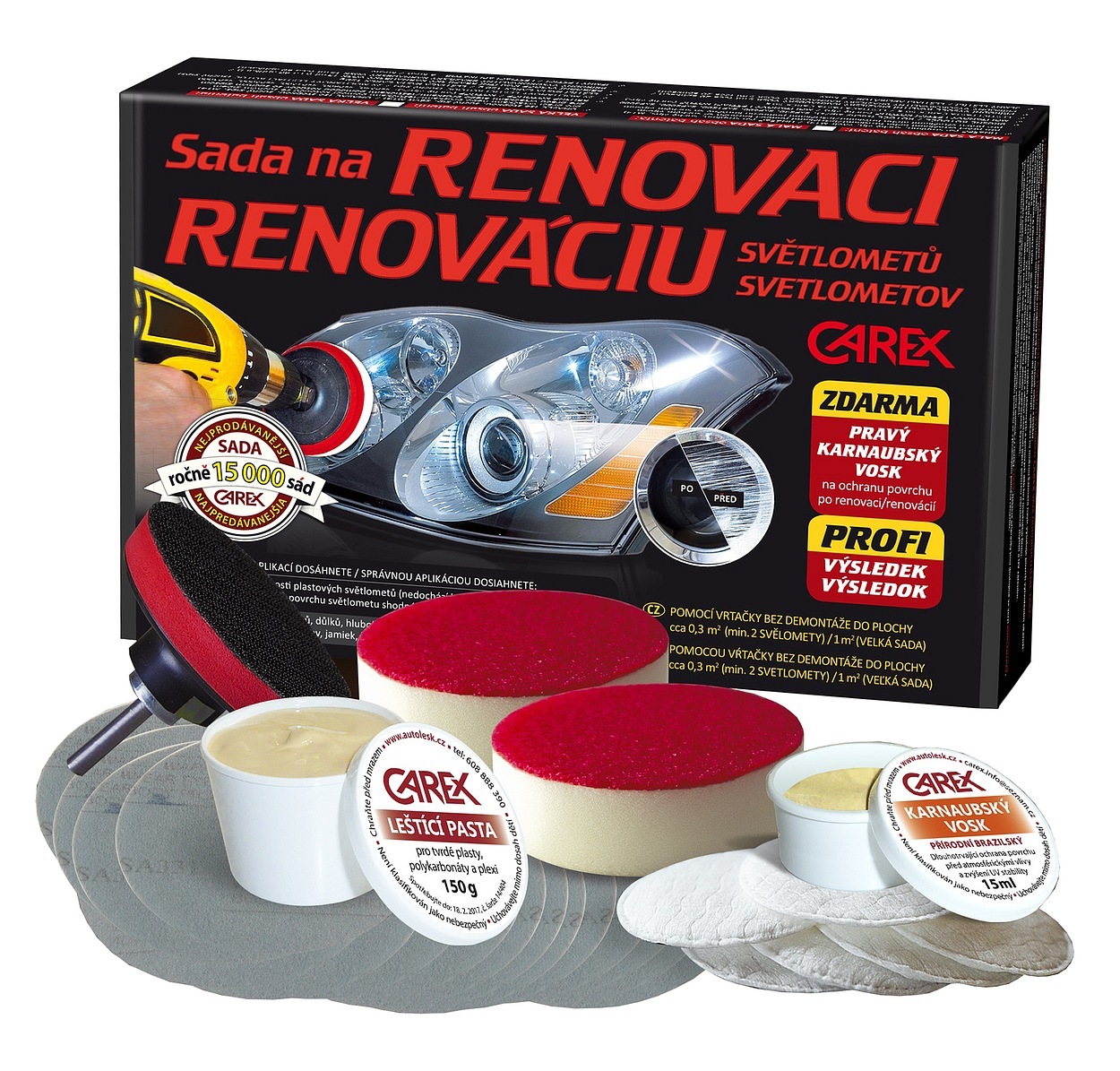 Sada na renovaci světlometů CAREX 90710 Velká renovační sada k mechanickému odstranění poškozené vrstvy světlometů Tato sada se používá u poškrábaných, popraskaných, či jinak hloubkově poškozených světlometů. Broušením a následným leštěním se navrací čirost, povrchová zašedlost, zežloutnutí i zmatnění světlometů. Pomocí běžné, či aku vrtačky odstraní vrypy, důlky od kamínků, oděrky, praskliny a jiné povrchové vady u součástí z tvrzených, nejen čirých, plastů určených pro motorismus, apod. Leštění se provádí pouze mechanicky, bez chemického znehodnocení povrchu světlometu. Jelikož je leštící pasta CAREX na vodní bázi, není tedy chemicky agresivní, jako pasty konkurenční, určené vesměs pro leštění ruční. Použití: Světlomety se umyjí, osuší a okolní části oblepí např. malířskou páskou. Unašeč se uchytí do vrtačky, na něj se suchým zipem připevní brusný kotouč dané zrnitosti dle výchozího stavu světlometu. Zabroušení vad na povrchu se provádí zrnitostí P240 nasucho, dalšími zrnitostmi za současného zvlhčování povrchu vodou až po použití zrnitosti P3000. Dále se na unášeč připevní leštící molitan, navlhčený pár kapkami vody, prstem se na něj nanese trochu leštící pasty a povrch světlometů se leští až do požadovaného stavu, za občasného zvlhčování molitanu nebo přidávání pasty. Po umytí a osušení se na povrch nanese aplikátorem tenký ochranný film karnaubského vosku, který se druhým aplikátorem po 20ti minutách rozleští. Díky strojnímu použití sady je výsledek nesrovnatelný v porovnání s leštěním ručním. Obsah balení: