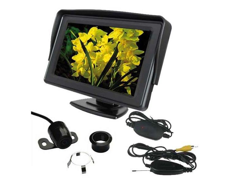 Bezdrátový parkovací set - kamera s 4,3" monitorem je určena pro detekci překážek za vozidlem. Systém je aktivován při zařazení zpátečky, přenos signálu mezi kamerou a monitorem probíhá bezdrátově, nemusíte vést žádné kabely mezi přední a zadní částí vozu! Kamera zobrazuje prostor za vozidlem na 4,3" displeji LCD. Kamera CMD má snímací úhel 170 stupňů a je určena k montáži do nebo vně nárazníku např. nad SPZ.