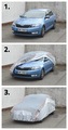 Ochranná plachta proti krupobití, k překrytí celého vozidla. Vysoká odolnost proti povětrnostním vlivům, voděodolná. Horní část vyztužená zesíleným materiálem, který dokáže absorbovat nárazy krup při krupobití a tím zamezí poškození vozidla. Jednoduché upevnění plachty - pouze se nasadí na automobil, na spodku se upevní část s všitou gumou za vhodné záhyby karoserie / nárazníku a přední i zadní část plachty se důkladně upevní pomocí všitých popruhů se sponami.