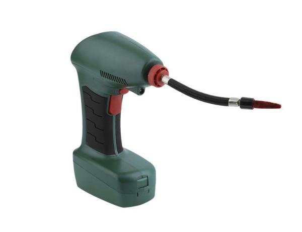 Vzduchový kompresor vybavený měřičem tlaku s adaptérem pro klasický autoventilek. Je určen k dofukování pneumatik osobního automobilu, jízdních kol, nafukovacích hraček, matrací atd. Napájení 12 V, kabel se zástrčkou do zásuvky automobilového zapalovače. Součástí balení jsou přídavné adaptéry pro huštění gumových matrací, míčů apod.