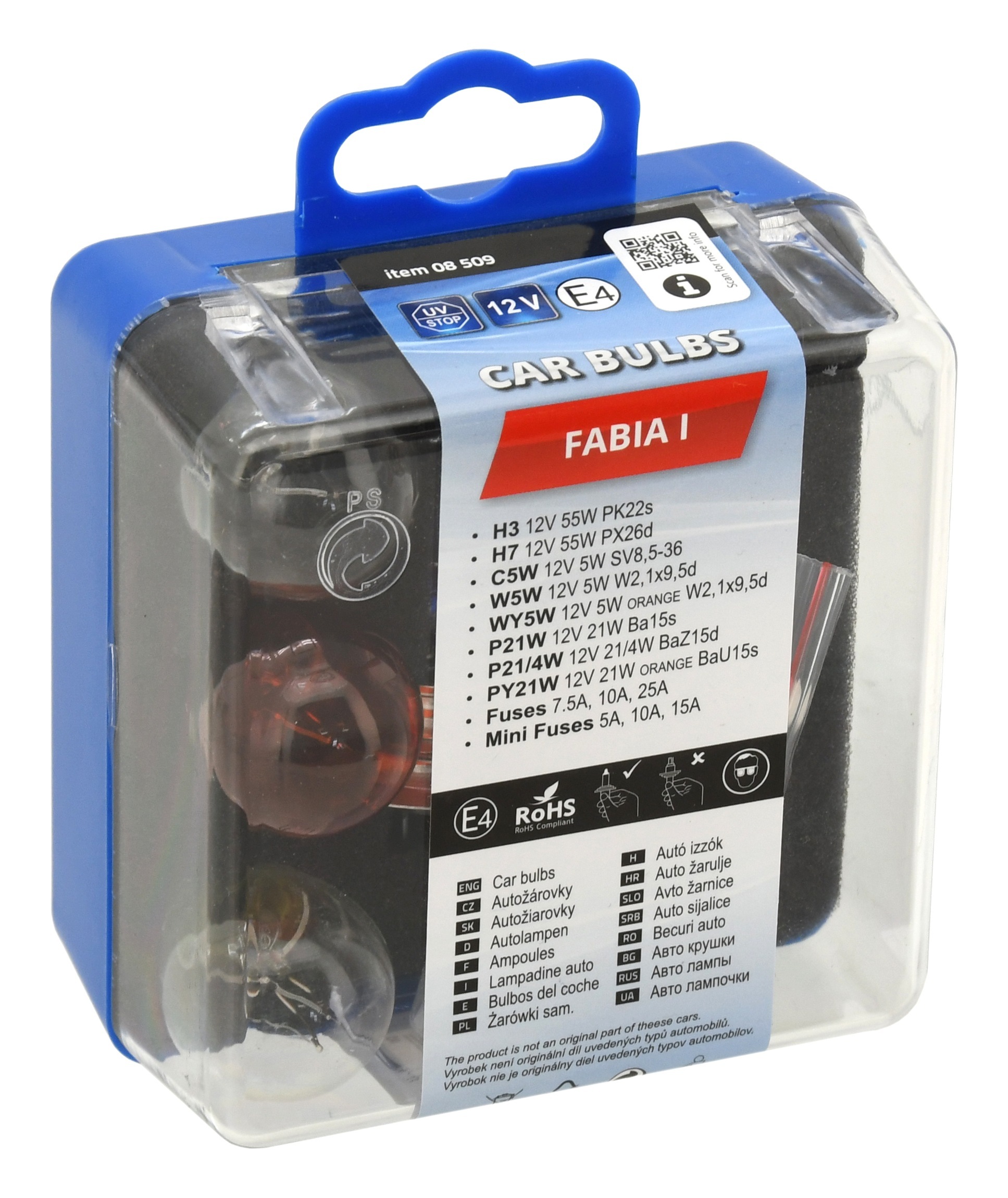 Plastová krabička náhradních autožárovek a pojistek, homologace E.
