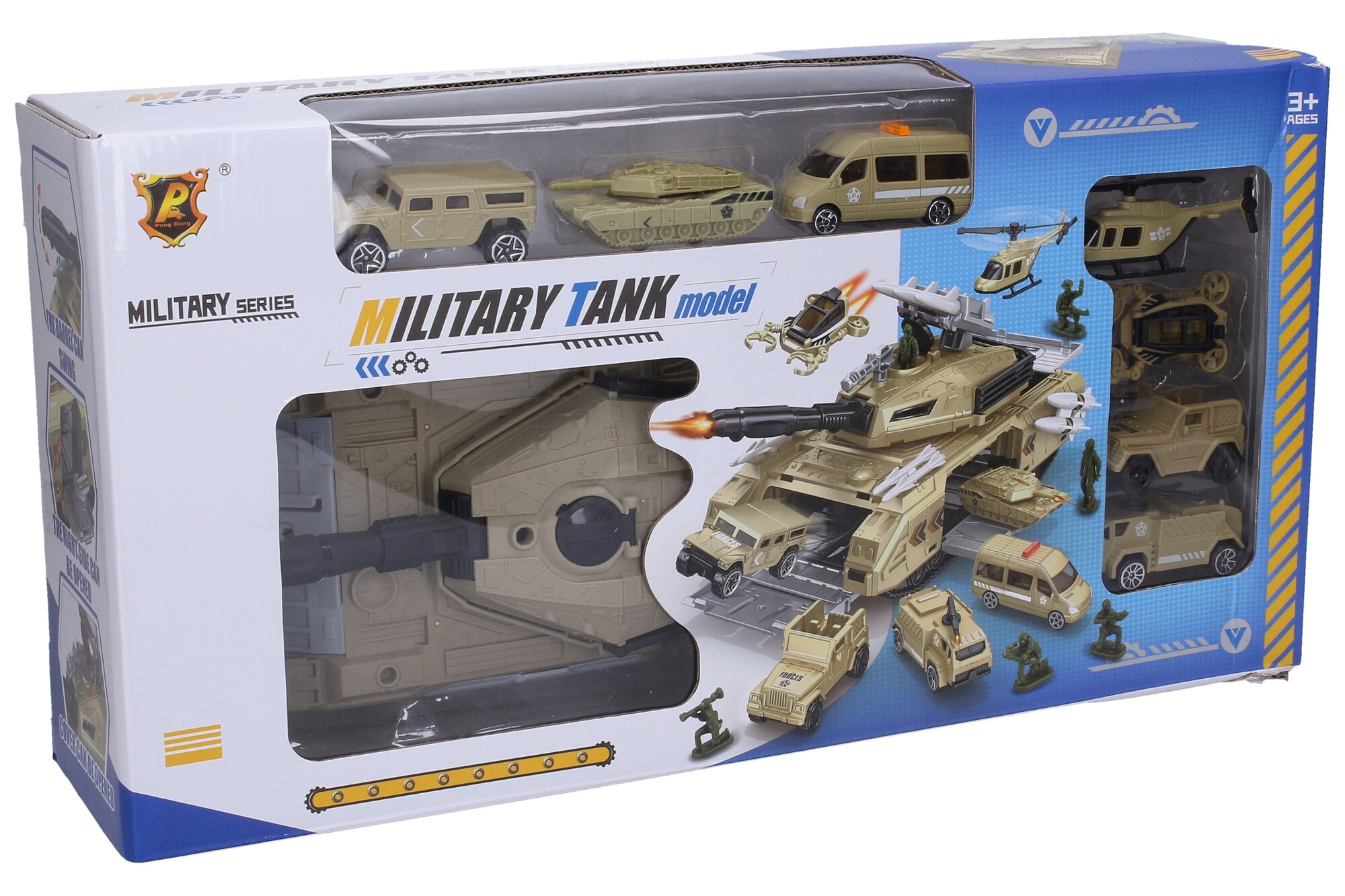 Vojenská stanice tank. Velikost velkého tanku 26 cm, malých vozidel a vrtulníku 7-8 cm. Volná kola. Obsahuje: velký tank, 7 vojenských dopravních prostředků, 10 figurek vojáků, zbraně, polepy. Obrázkový návod na sestavení na zadní straně obalu. číst celé