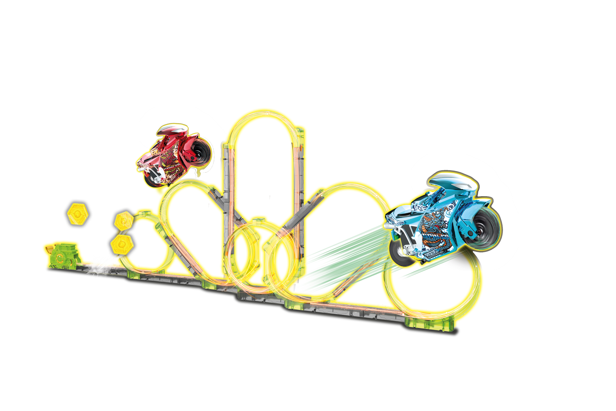 Spin and Build Super dráha s 2 motorkami. S vystřelovacím zařízením. Dojezd motorky 50 m, na setrvačník s gyroskopem. Velikost motorky 4,5 cm. číst celé