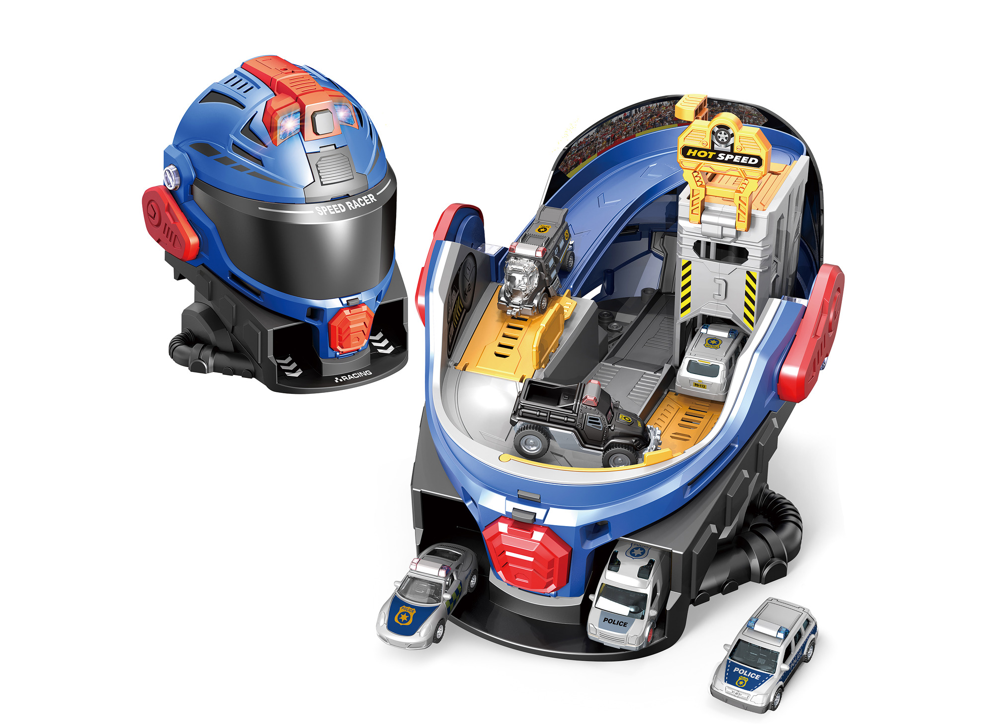 Policejní stanice helma. Rozměry 20x32x20 cm. Světelné a zvukové efekty tlačítkem na helmě. 3xAG13 baterie součástí. Součástí 4 kovová auta 6,5 cm s volnými koly, výtah. číst celé