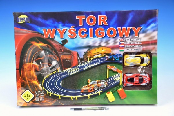 Autodráha závodní + 2 auta plast 215cm na baterie v krabici 49x33x5cm