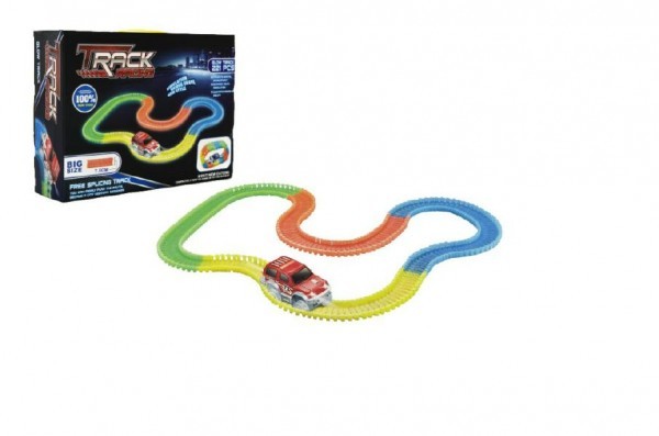 Dráha svítící + auto plast 221ks délka 3,2m na baterie v krabici 35x26x9cm